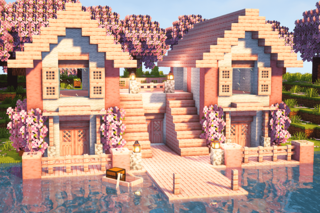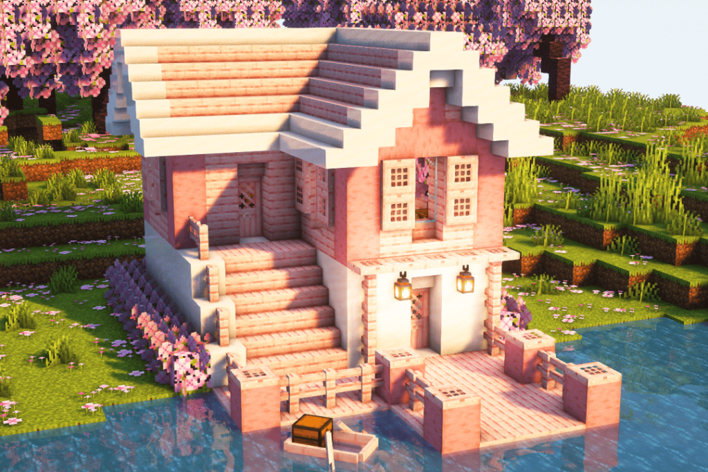 A charming cherry blossom lakeside house built with soft pink tones, perfectly set along the water for a peaceful survival base. It offers a cozy interior with room for storage, crafting, and living essentials, making it both aesthetic and practical for everyday gameplay.