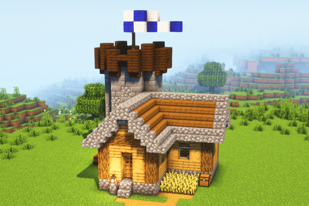 This small starter castle is perfect for early survival worlds. With a stone lookout tower connected to a medieval house. There is a small farm and some chests outside. Note: This build does not include an interior, leaving it fully customizable!