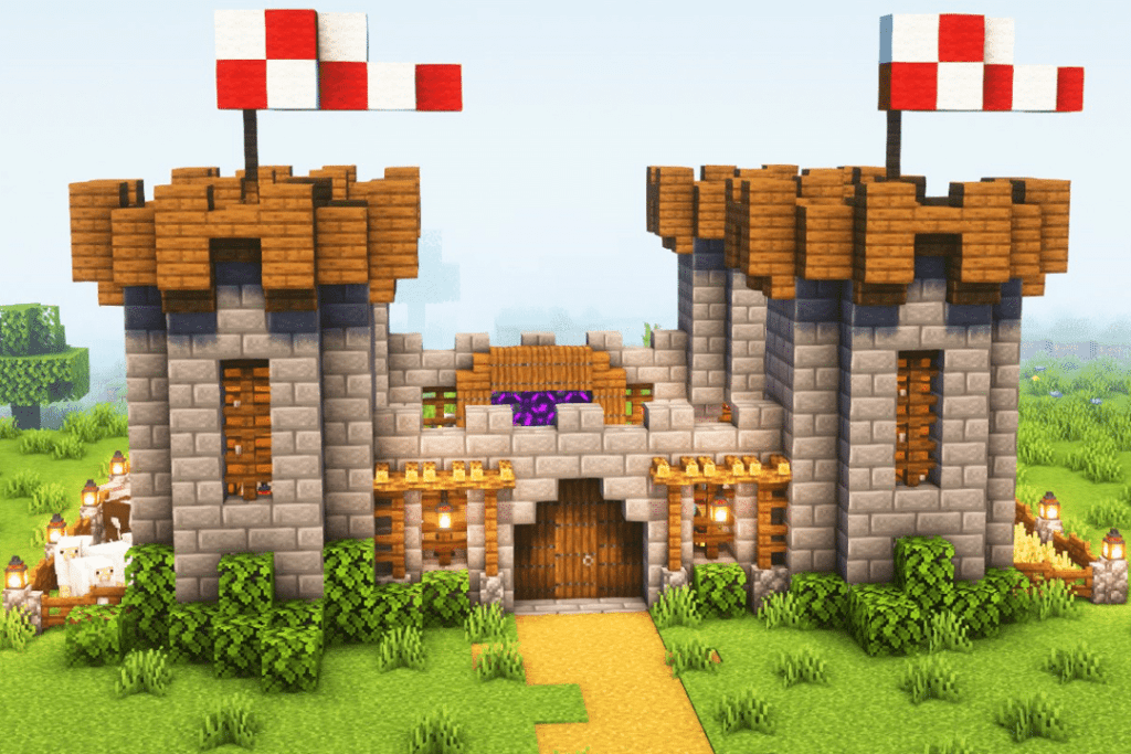 A detailed medieval castle featuring stone towers, wooden rooftops, and decorative flags that give it a classic fortress feel. Inside, the castle offers plenty of room for storage and survival essentials, making it a strong base for any survival or medieval-themed world.