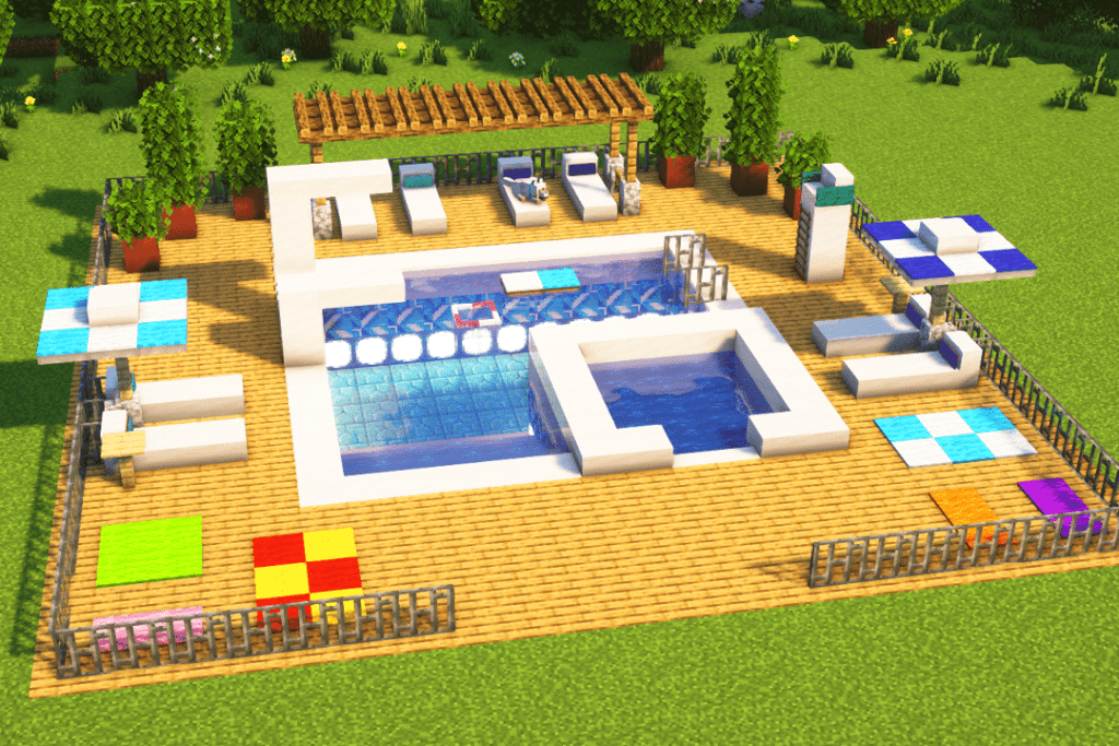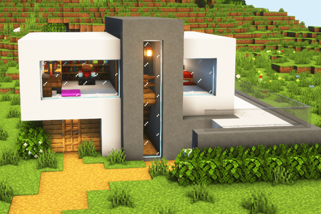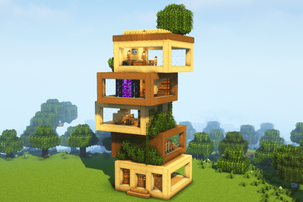 It’s a 3-floor modern house designed for ultimate design and function. The build features a swimming pool, balconies, an enchanting room, and the essential blocks perfect for survival or creative worlds.