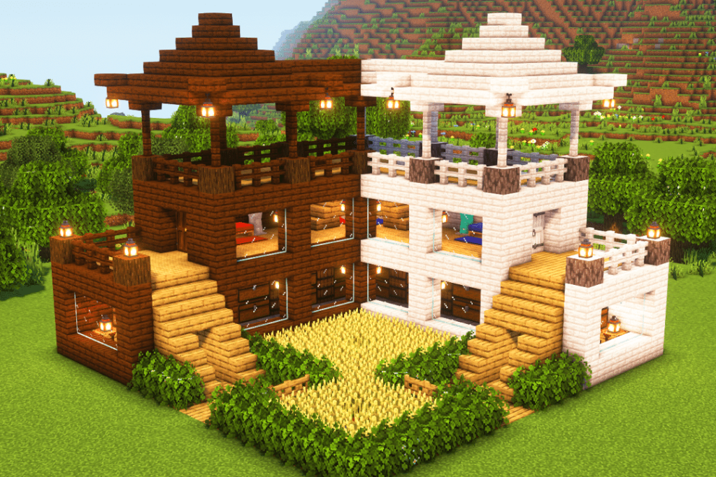 This unique duo survival house blends dark oak and pale oak into one connected structure. Featuring a lookout balcony, storage basement, full interior, and a central wheat farm. It’s perfect for cooperative survival or stylish solo play.