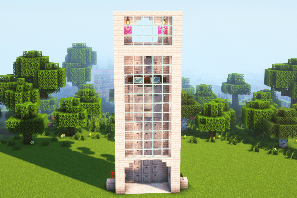 It’s a modern glass elevator powered by the new Happy Ghast mob. Ride smoothly between floors in style with this fun and functional design. Perfect for quick vertical travel in any base.