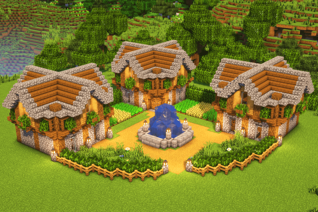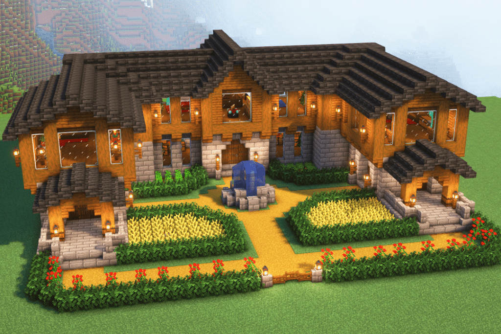 This elegant starter mansion combines rustic charm with functionality. Its wide layout features two grand wings and an open upper floor, offering plenty of space for crafting, storage, and decorating. A central stone fountain anchors the front yard, surrounded by lush greenery and crop farms, making it both a stylish home and a strong early-game base.