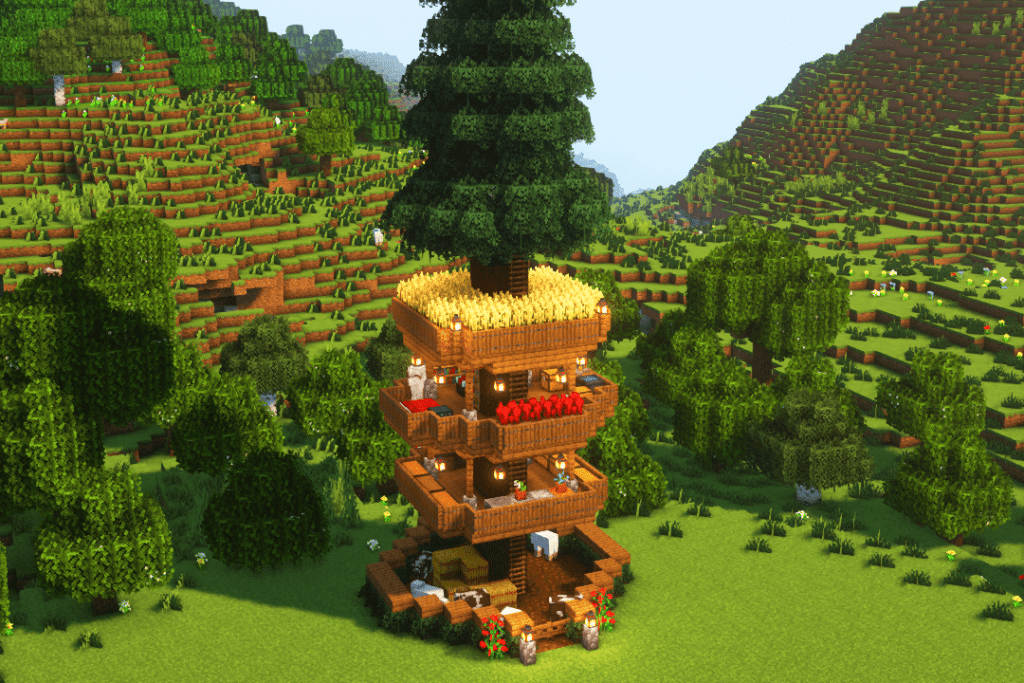 This 4-floor survival treehouse is built around a massive spruce tree, blending function and style. The bottom floors feature storage and crafting while the upper levels hold workstations and a rooftop wheat farm. With balconies for stunning views and a natural design, it’s the perfect base for survival.