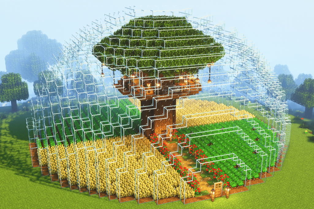 This dome treehouse combines survival essentials with a stunning design. Inside the massive glass dome, a giant tree hosts a cozy bedroom and enchanting setup, while the ground level is filled with organized crop farms. Safe, functional, and beautiful, it’s the ultimate self-sustaining survival base.