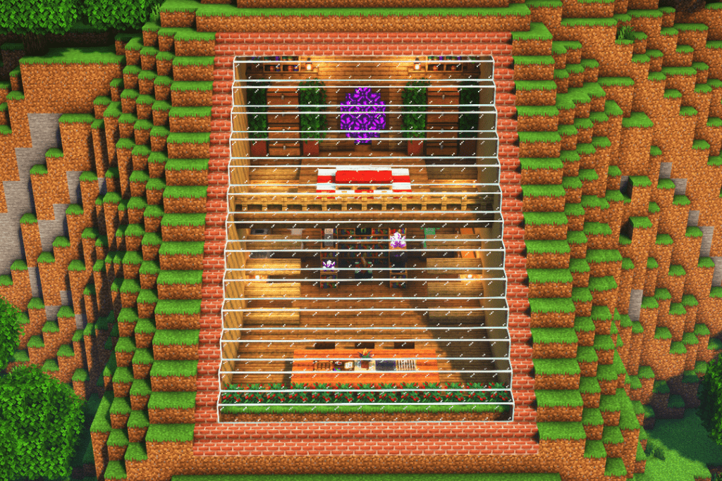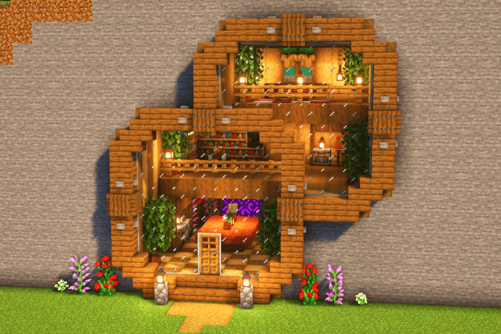 An ultimate three-story mountain house carved directly into the cliffside, blending spruce wood with natural stone for a seamless look. Inside, each level is thoughtfully designed with space for sleeping, storage, and enchanting, making it a compact yet fully functional survival base.