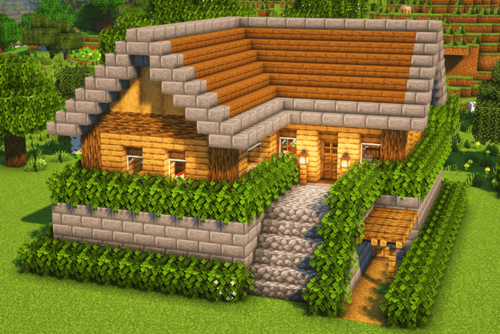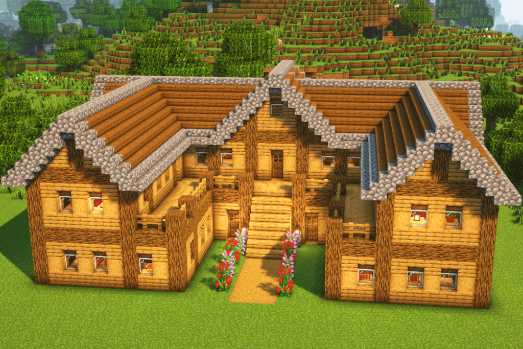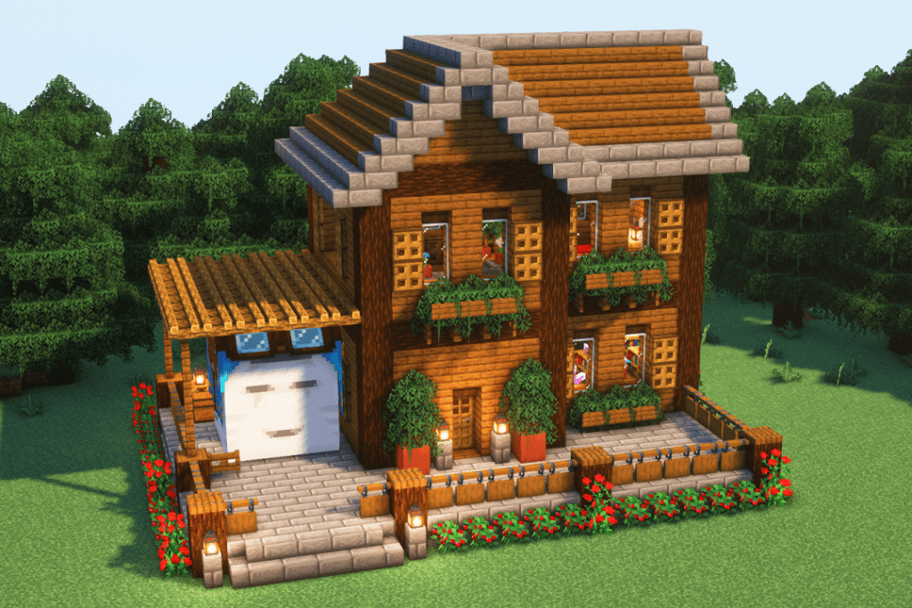 This spruce house has a cozy design, built with warm spruce wood and stone brick accents. Flower boxes decorate the windows, while lanterns and plants bring life to the exterior. A side garage and fenced yard add detail, making it both functional and stylish, a perfect survival house.