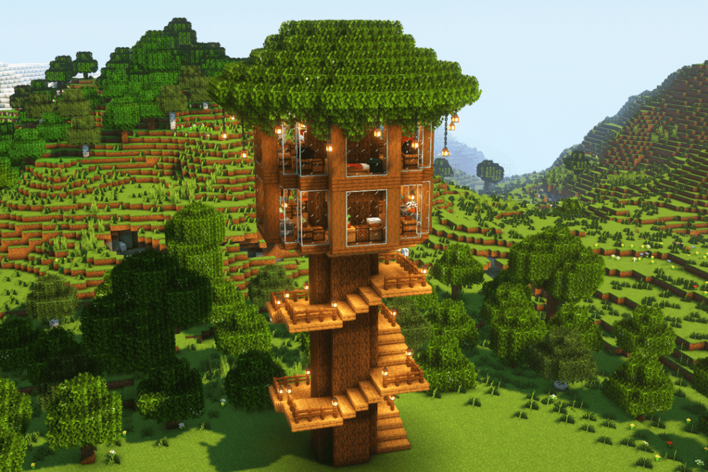 It’s a 2-player treehouse with two large platforms connected by bridges, each holding cozy rooms for storage, crafting, and relaxing. Hanging lanterns light up the leaves, creating a warm and magical look perfect for survival bases.