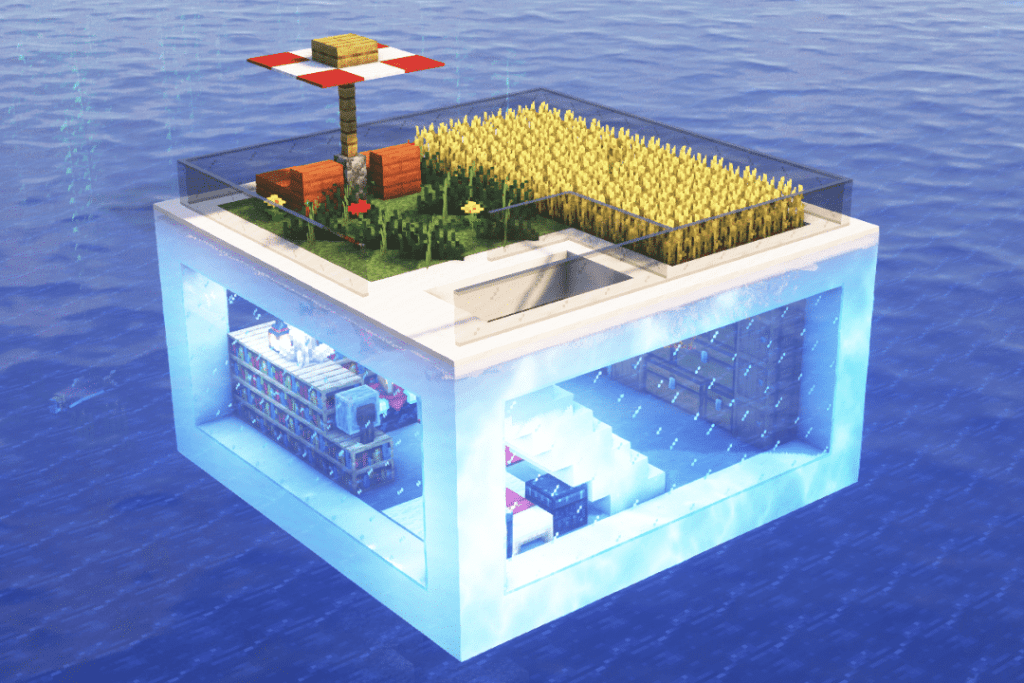 This underwater modern house combines sleek design with full survival functionality. Inside, you’ll find a cozy bedroom, enchanting setup, and organized storage, while the glass walls offer stunning ocean views. On top, there’s a crop farm and a relaxing outdoor area, perfect for enjoying the sun above your hidden ocean base.