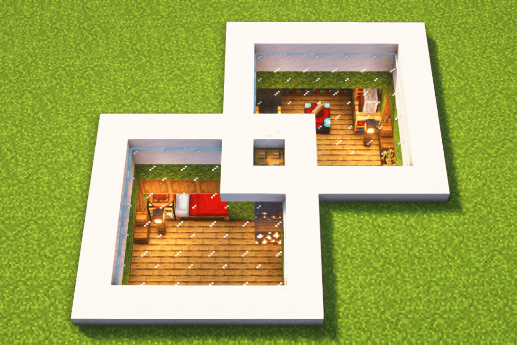 A compact paired starter home featuring two cozy living spaces connected by a shared central staircase. Each side includes its own small upstairs room and a crop farm underneath for early-game food. Simple, efficient, and perfect for two players starting out together.