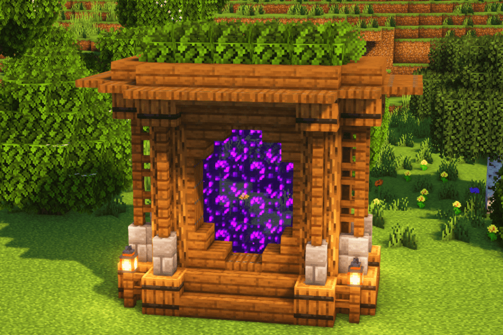This wooden Nether portal build adds style and structure to a simple portal frame. Surrounded by beams, stairs, and lantern lighting, it turns the entrance to the Nether into a cozy, decorative feature. With leaves lining the roof and detailed woodwork all around, it’s a perfect way to blend your portal naturally into any survival world.