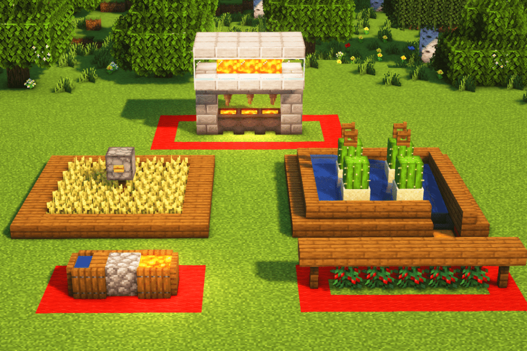 A set of 5 essential starter farms designed to kickstart any survival world efficiently. It includes a cobblestone generator, crop farm, sweet berry farm, cactus farm, and a lava farm for renewable fuel, building blocks, food, and early resources.
