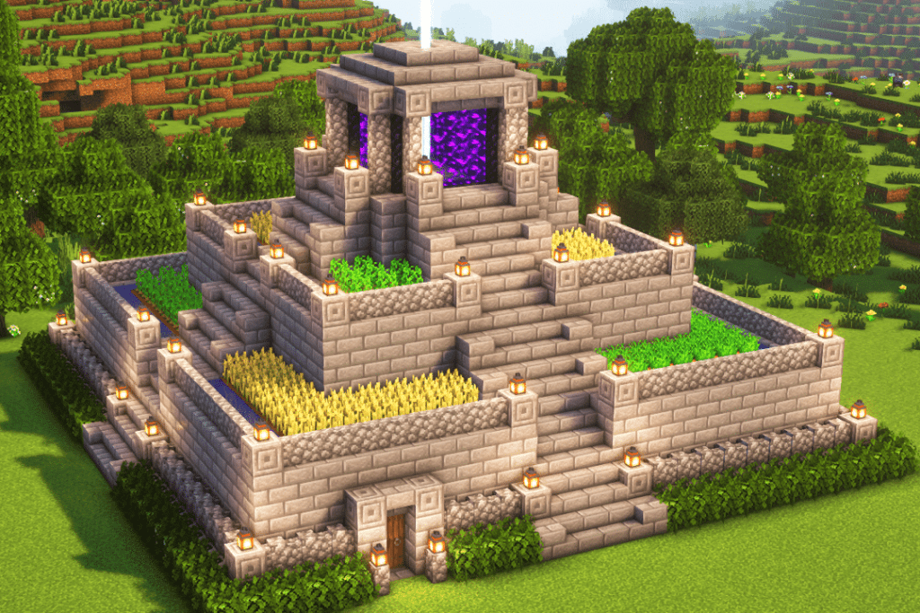 A multi-layered stone survival temple designed for both functionality and style, featuring a fully equipped interior with all your essential crafting, storage, and living spaces. Tiered farms wrap around each level for efficient resource gathering, while the beacon-powered central chamber and nether portal at the top make this build a powerful base for mid to late game progression.