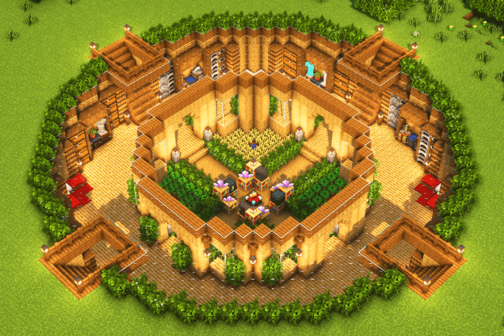 This 10 player house is a massive community build designed for teamwork and survival. Each player has their own private room along the circular layout, with farms, trees, and a central fountain creating a shared hub. Surrounded by organized pathways and crops, it’s the ultimate base for large groups to live, farm, and thrive together.