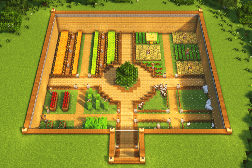 This underground city is a fully self-sufficient survival hub, protected by high walls and organized into sections. Inside, you’ll find animal pens, crop farms, tree groves, housing, and crafting areas, all centered around a beautiful fountain plaza.
