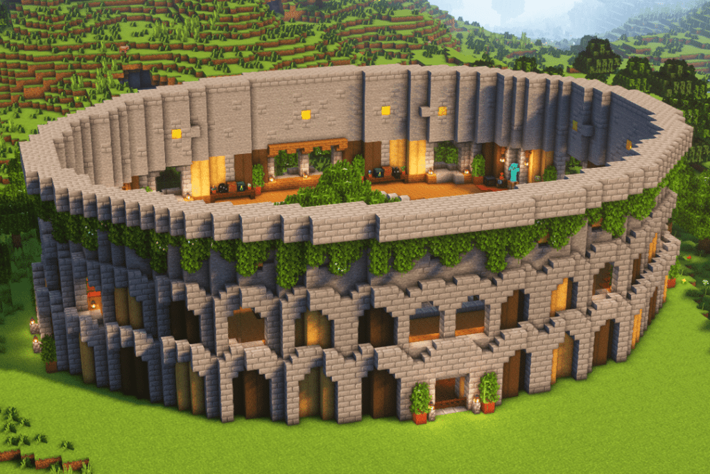 An ultimate colosseum base built from layered stone and arches, featuring raised walls with subtle gold details set among leaves for an arena-style look. Inside, the circular layout is packed with survival essentials including storage, enchanting, crafting, and living spaces, all centered around a large tree growing in the middle of the base.